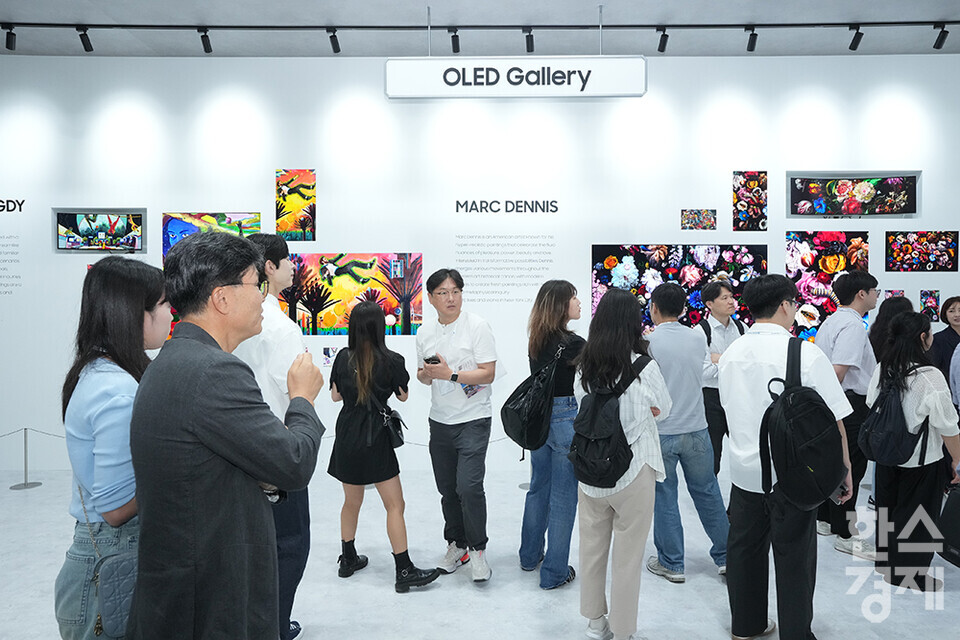 최신 디스플레이 기술을 한자리에서 볼 수 있는 '2025 한국디스플레이산업전시회(K-Display 2025)'가 7일 서울 강남구 코엑스에서 열리고 있다. 관람객들이 삼성디스플레이 부스에 마련된 OLED 갤러리 전시물을 감상하고 있다. /최대성 기자 dpdaesung@sporbiz.co.kr 2025.08.07.