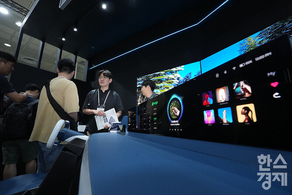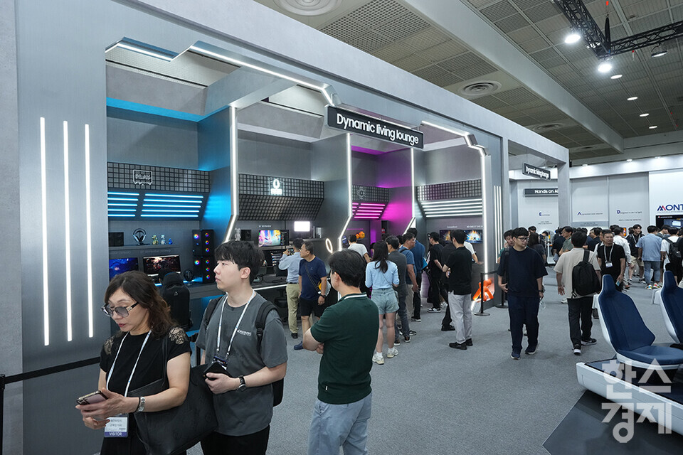 최신 디스플레이 기술을 한자리에서 볼 수 있는 '2025 한국디스플레이산업전시회(K-Display 2025)'가 7일 서울 강남구 코엑스에서 열리고 있다. 관람객들이 삼성디스플레이 부스에 마련된 다이나믹 리빙 라운지 전시물을 감상하고 있다. /최대성 기자 dpdaesung@sporbiz.co.kr 2025.08.07.