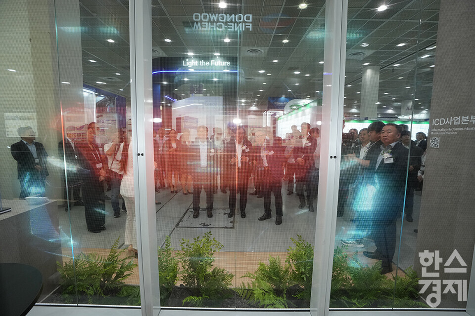 최신 디스플레이 기술을 한자리에서 볼 수 있는 '2025 한국디스플레이산업전시회(K-Display 2025)'가 7일 서울 강남구 코엑스에서 열리고 있다. 정철동 LG디스플레이 사장, 문신학 산업통상자원부 차관, 이승우 한국디스플레이산업협회 부회장을 비롯한 내빈들이 동우화인켐 부스에 마련된 디스플레이 전시물을 감상하고 있다. /최대성 기자 dpdaesung@sporbiz.co.kr 2025.08.07.