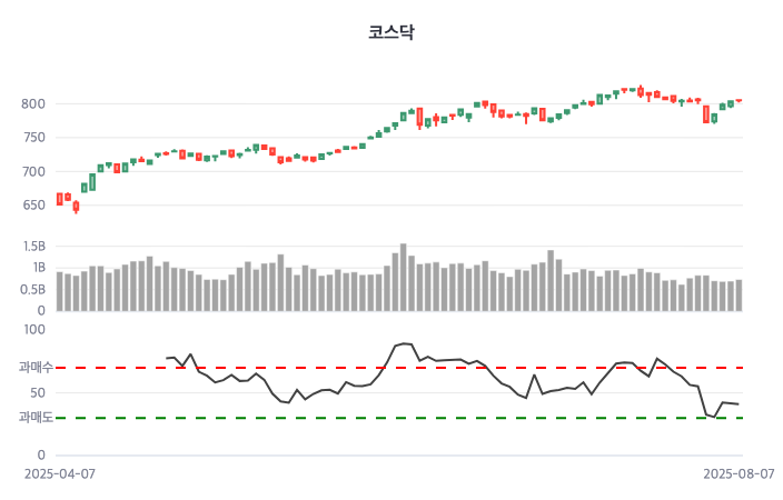 금일 코스피는 관세 발효 이후에 삼성전자와 SK하이닉스는 관세에서 제외되면서 반도체 시총 상위종목들이 지수를 상승으로 이끌면서 상승폭을 키웠다. 코스닥 또한 800선을 유지하면서 강보합 마감했다.