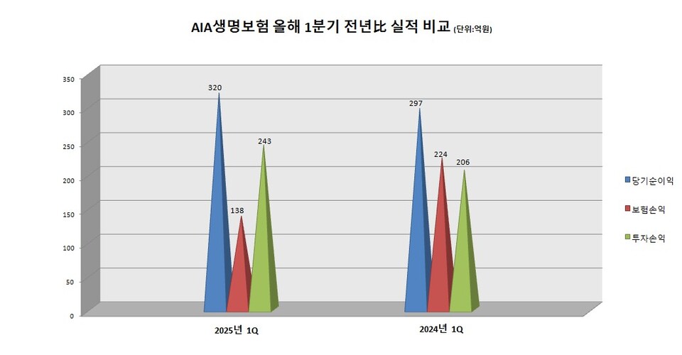 AIA생명이 올해 1분기 320억원의 당기순이익을 기록했다. 이는 지난해 동기(297억원) 대비 7.7%(23억원)가 증가한 수치다. 투자손익이 늘어난 반면 보험손익은 줄어들어 영업이익은 426억원으로 지난해 동기(430억원) 대비 4억원이 줄었다.