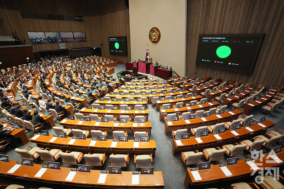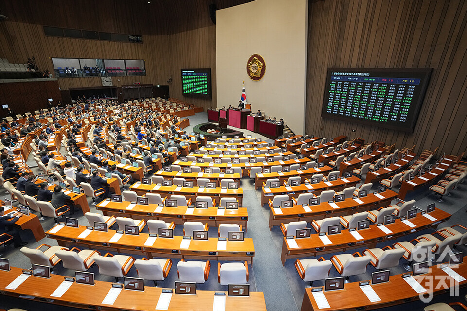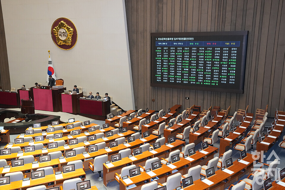21일 서울 여의도 국회 본청에서 제428회 국회(임시회) 제1차 본회의가 열리고 있다. 국민의힘 의원들이 불참한 가운데 방송문화진흥법 일부개정법률안(대안)이 재석171인, 찬성 169인, 반대 1인, 기권 1인으로 통과되고 있다. /최대성 기자 dpdaesung@sporbiz.co.kr 2025.08.21.