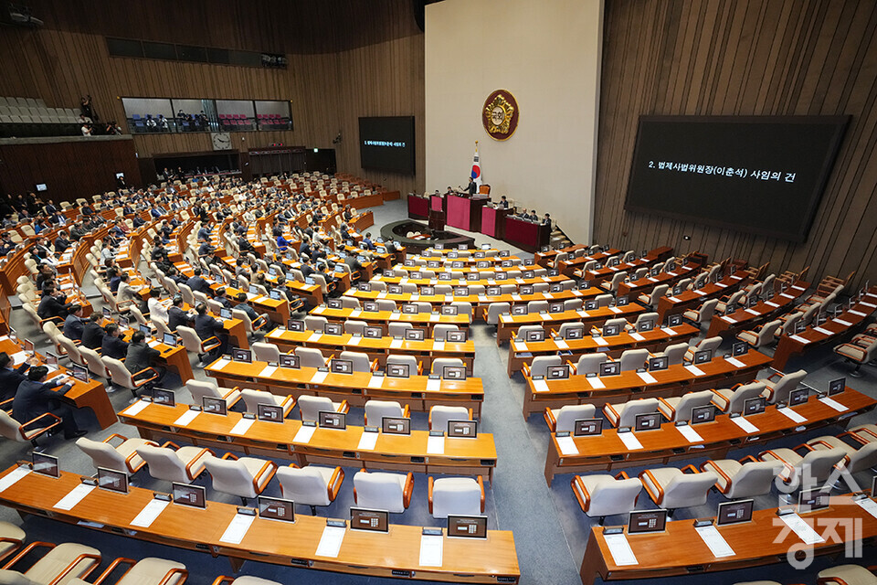 21일 서울 여의도 국회 본청에서 제428회 국회(임시회) 제1차 본회의가 열리고 있다. 국민의힘 의원들이 불참한 가운데 법제사법위원장(이춘석) 사임의 건 표결이 진행되고 있다. /최대성 기자 dpdaesung@sporbiz.co.kr 2025.08.21.
