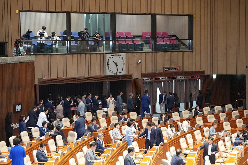 21일 서울 여의도 국회 본청에서 제428회 국회(임시회) 제1차 본회의가 열리고 있다. 국민의힘 의원들이 불참한 가운데 방송문화진흥법 표결이 진행되고 있다. /최대성 기자 dpdaesung@sporbiz.co.kr 2025.08.21.