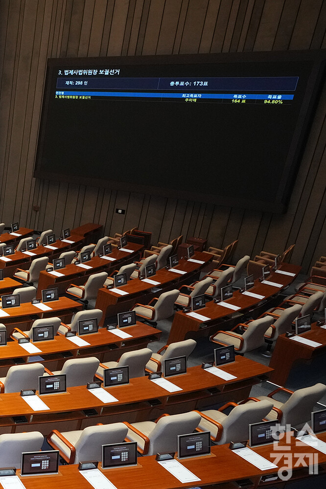 21일 서울 여의도 국회 본청에서 제428회 국회(임시회) 제1차 본회의가 열리고 있다. 추미애 의원이 신임 법사위원장에 당선되고 있다. /최대성 기자 dpdaesung@sporbiz.co.kr 2025.08.21.