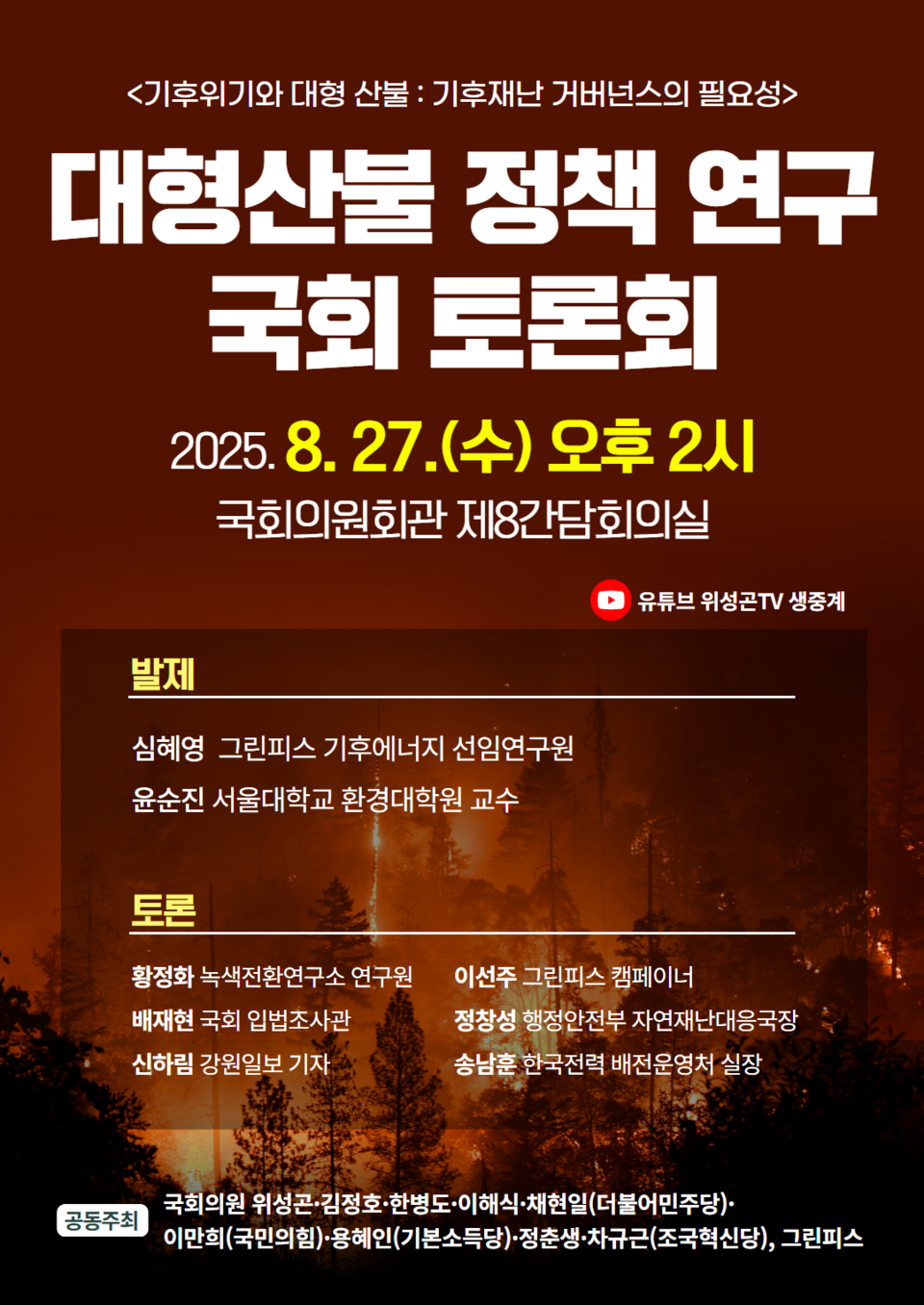 토론회는 위성곤 · 김정호 · 한병도 · 이해식 · 채현일 의원(더불어민주당), 이만희 의원(국민의힘), 용혜인 의원 (기본소득당), 정춘생 · 차규근 의원 (조국혁신당)과 그린피스가 공동으로 주최한다. 특히 국회 행정안전위원회와 기후위기특별위원회, 산불특별위원회 소속 의원들이 함께 참여해 논의의 무게를 더했다.