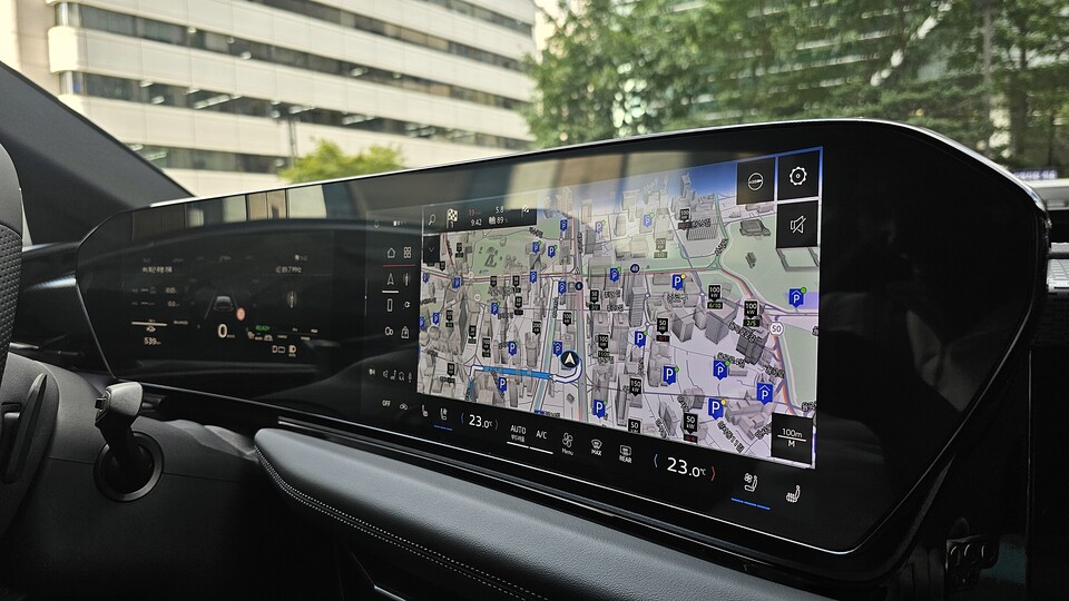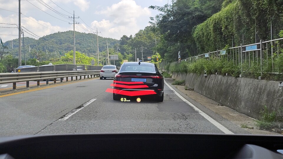 본격적인 주행을 위해 시동을 거는 순간 운전석 앞 유리에는 'AR(증강현실) 헤드업 디스플레이'가 눈에 들어온다. 이 헤드업 디스플레이는 내비게이션과 연동돼 경로 안내나 앞 차량과의 간격 등을 증강현실로 안내해 직관적인 정보를 실시간으로 보여준다. 제공되는 정보의 폰트와 크기도 적절해 운전 중 방해되는 요소 없이 깔끔하다.