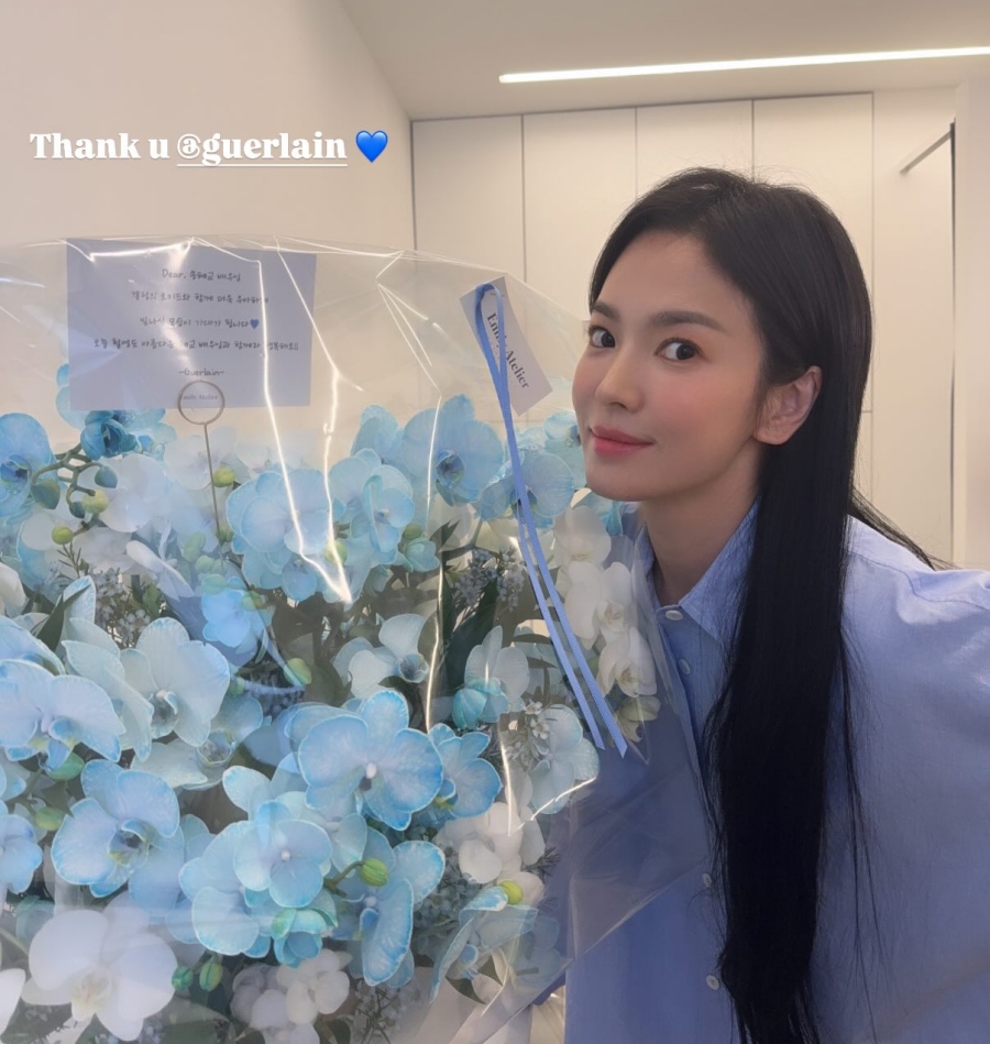 공개된 사진 속 송혜교는 푸른빛 셔츠를 입고 대형 꽃다발을 안은 채 카메라를 향해 미소를 짓고 있다.