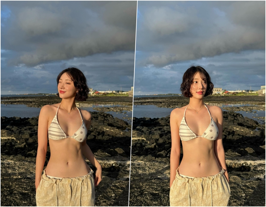 사진 속 김민경은 제주 해안에서 비키니 수영복을 입고 은근한 볼륨감과 잘록한 허리 라인을 자랑하며 사진을 찍고 있다.