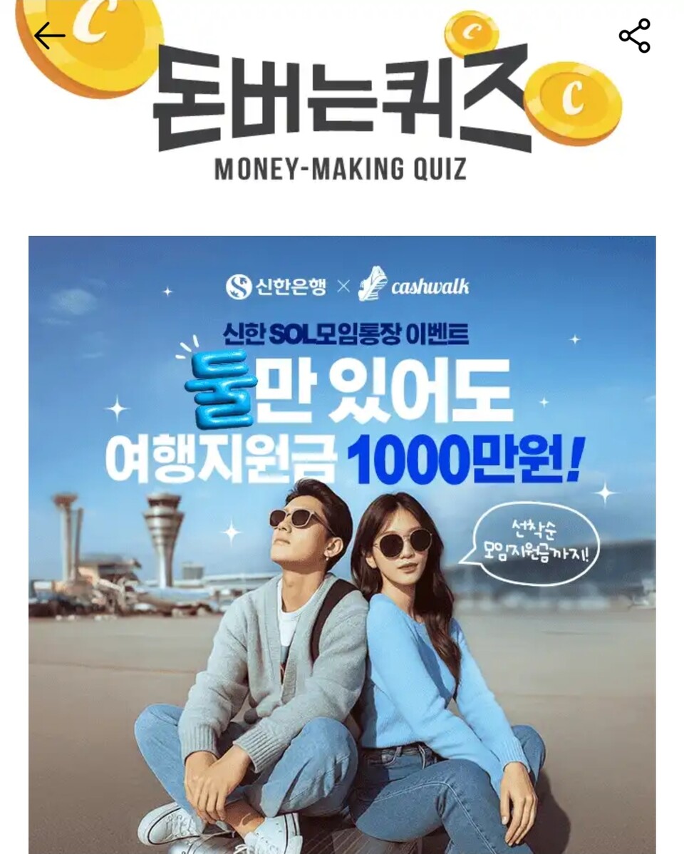 신한은행 캐시워크돈버는퀴즈 문제는 "여행지원금 1,000만원과 모임지원금 2만원을 선착순 OO명에게 주는 신한 SOL모임통장 이벤트"이다.