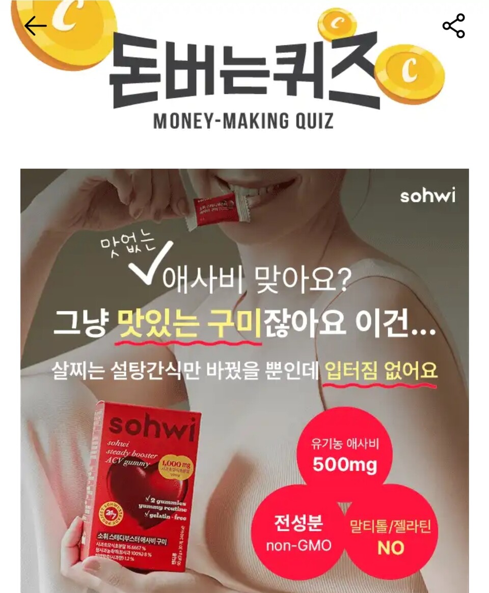소휘 애사비 구미 캐시워크돈버는퀴즈 문제는 "식욕못참는 가장 큰원인 OOOO 확실하게 도와드려요!"이다.