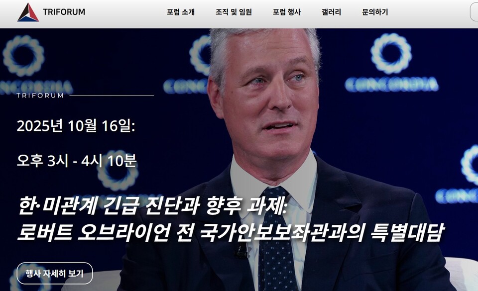 트라이포럼(대표 박대성)은 ‘한•미관계 긴급 진단과 향후 과제’를 주제로 로버트 오브라이언 전 미 백악관 국가안보보좌관과의 특별 대담을 오는 16일 서울 중구 프레스센터 내셔널프레스클럽에서 연다고 4일 밝혔다.
