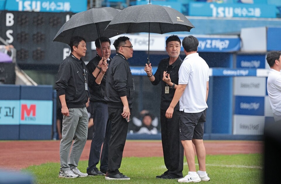이날 대구 지역은 오전부터 산발적으로 비가 내렸지만, 강수량이 많지는 않아 경기 시작 20분 전까지만 해도 정상 개시할 것으로 보였다. 그러나 오후 1시 40분을 기점으로 폭우가 쏟아지면서 접었던 방수포를 다시 펼쳤고, 30분 뒤 재차 걷었다. 한국야구위원회(KBO)는 "2시 45분에 경기를 진행할 예정이다"라고 밝혔다.