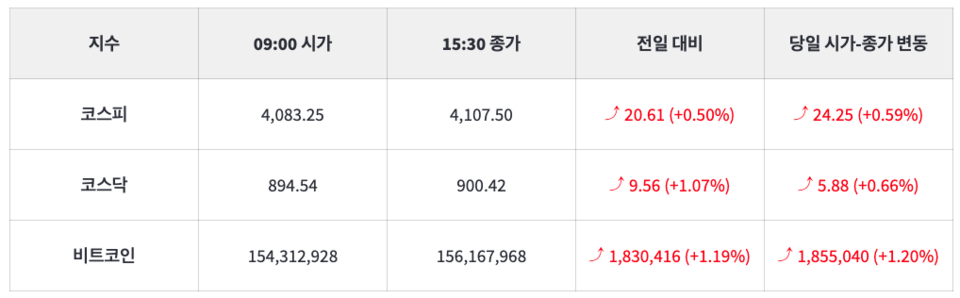 금일 코스피는 전일 주춤했으나 기관 매수세 힘입어 4100선을 돌파했다. 뿐만 아니라 젠슨 황 엔비디아 최고경영자의 회동과 투자발표속 호재를 동반하면서 상승 마감했다. 코스닥 또한 기관과 외인의 순매수에 힘입어 900선을 탈환하며 상승 마감했다.