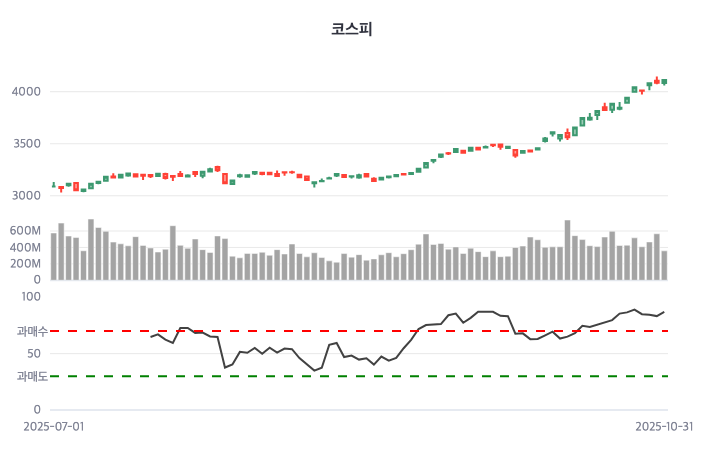 | 한스경제=김도현 기자 | 31일 코스피는 전거래일보다 0.50% 상승 마감했다. 한국거래소에 의하면 코스피 지수는 이날 오전 09시 4083.25에 개장해 장중 4122.09를 고점으로 기록한 후 오후 3시 30분 4107.50으로 상승 마감했다. 전거래일 대비 20.61포인트(0.50%) 상승했으며, 이날 시작가 대비해서는 24.25포인트(0.59%) 상승한 것이다.