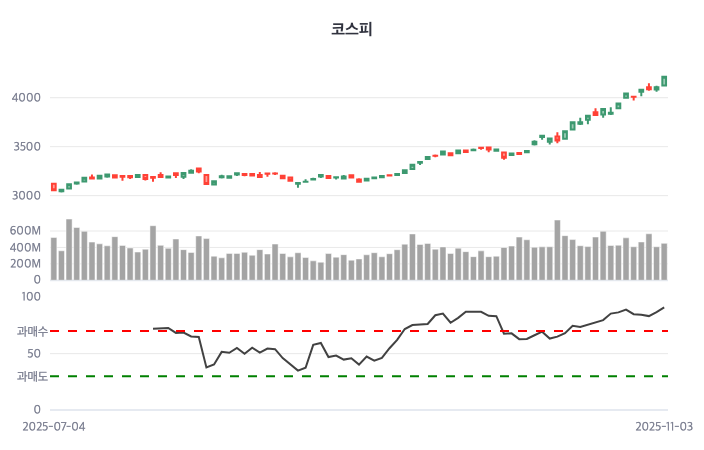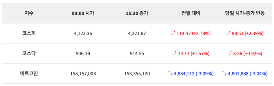 | 한스경제=김도현 기자 | 3일 코스피는 전거래일보다 2.78% 상승 마감했다. 한국거래소에 의하면 코스피 지수는 이날 오전 09시 4123.36에 개장해 장중 4216.93을 고점 기록한 후 오후 3시 30분 4221.87로 상승 마감했다. 전거래일 대비 114.37포인트(2.78%) 상승했으며, 이날 시작가 대비해서는 98.51포인트(2.39%) 상승한 것이다.