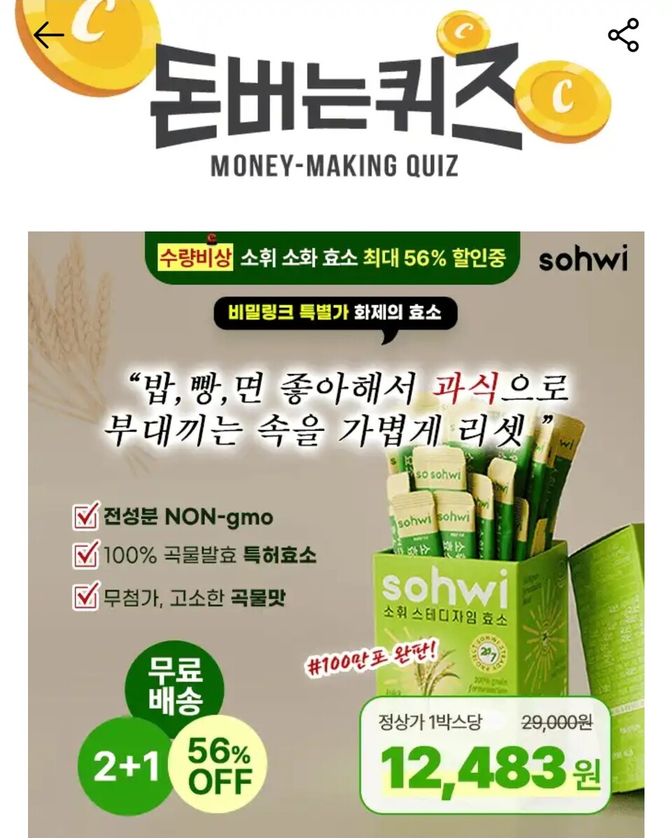 소휘 소화효소 캐시워크돈버는퀴즈 정답자에게는 최대 1만캐시 포인트가 제공된다.