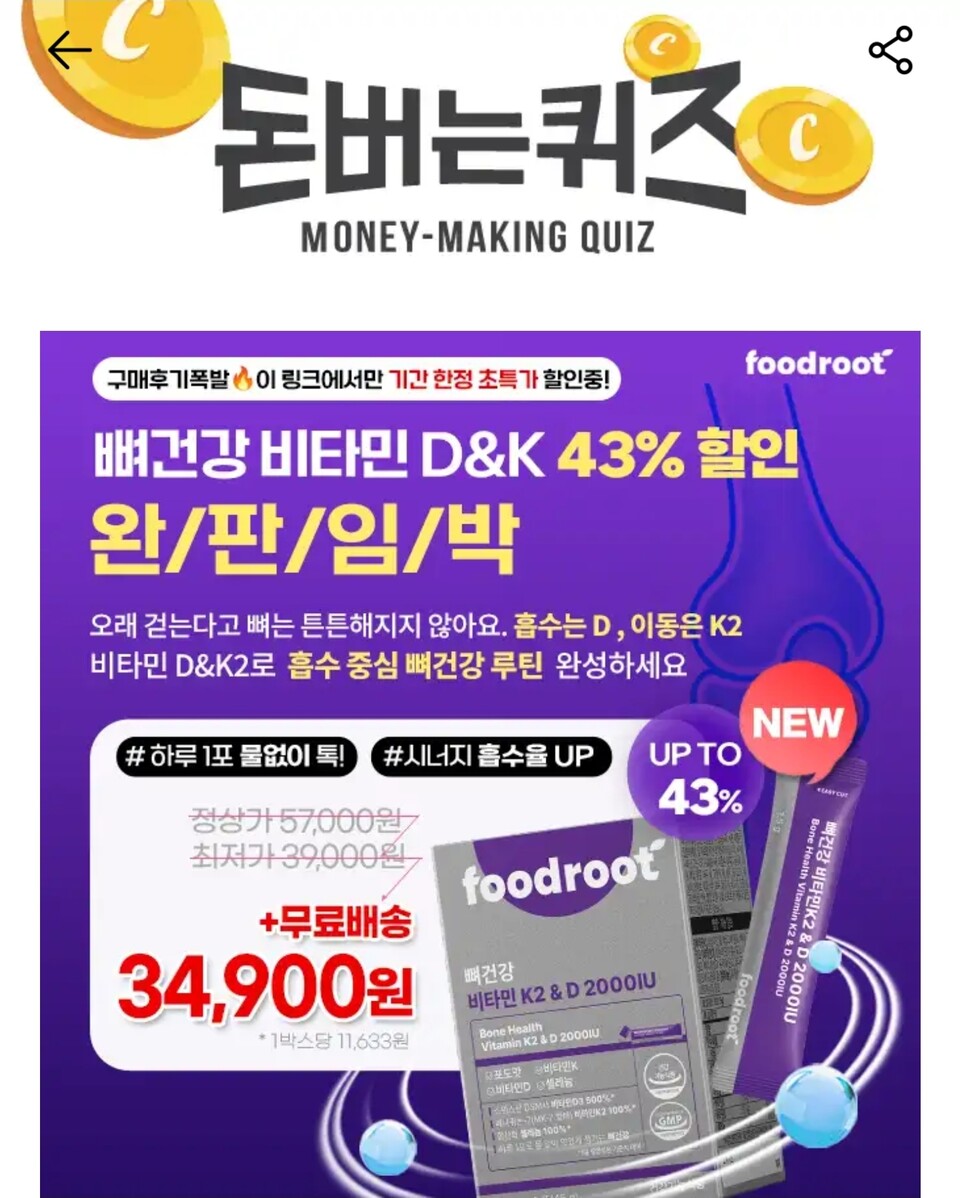 푸드루트 캐시워크돈버는퀴즈 문제는 "푸드로트 뼈건강 비타민은 튼튼한 뼈를 위한 비타민D 뿐 아니라, 뼈 구성에 필수인 OOOO7 비타민K2을 함께 배합해 체내 흡수율을 높였습니다"이다.