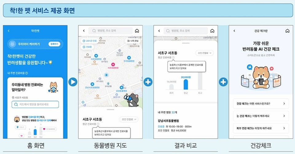 이용자는 '나의 관심 병원'을 등록해 관련 정보를 실시간으로 확인할 수 있으며 반려동물 맞춤형 펫보험의 보험료 계산·가입·보험금 청구가 가능한 배너 기능도 이용할 수 있다. 또한 건강 문진·AI 건강 체크·동물병원 비교로 이어지는 원스톱 건강관리 기능을 통해 체계적인 반려동물 건강 관리를 지원한다.