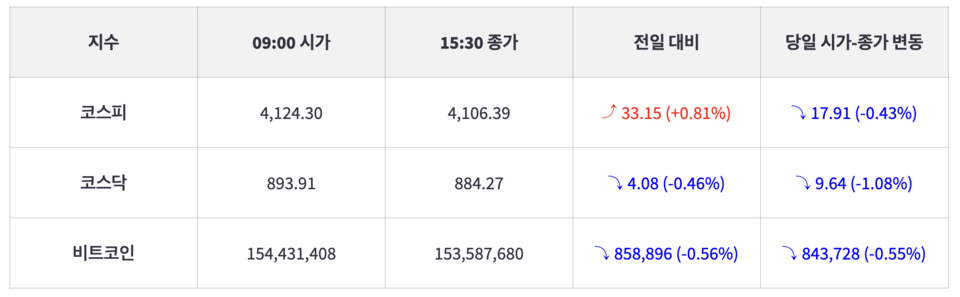 금일 코스피와 코스닥은 엇갈린 행보를 보였다. 특히 코스피는 4100대를 오고가며 여전히 상승을 보였다. 그러나 오후장 상승 모멘텀이 부재하며 상승폭을 줄이며 상승 마감했다. 반면에 코스닥은 장중 900선을 다시 회복하는듯 했으나, 880선으로 하락하며 기관 순매도에 하락 마감했다.