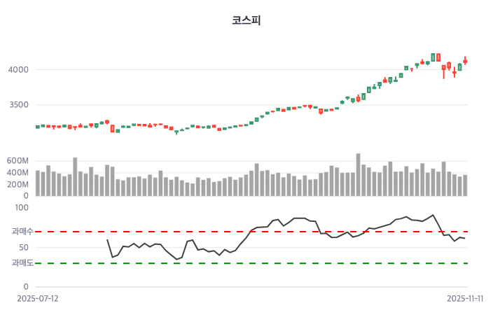 | 한스경제=김도현 기자 | 11일 코스피는 전거래일보다 0.81% 상승 마감했다. 한국거래소에 의하면 코스피 지수는 이날 오전 09시 4124.3에 개장해 장중 4187.46을 고점 기록한 후 오후 3시 30분 4106.39로 상승 마감했다. 전거래일 대비 33.15포인트(0.81%) 상승했으며, 이날 시작가 대비해서는 17.91포인트(-0.43%) 하락한 것이다.