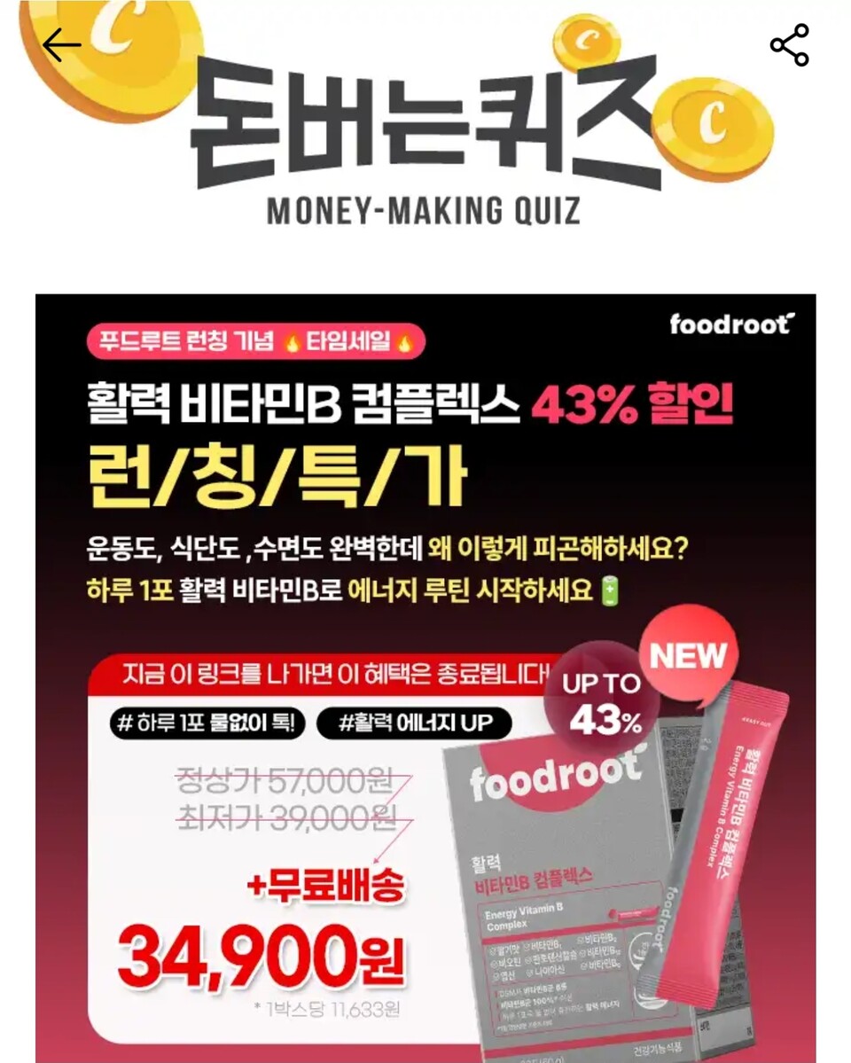 푸드루트 캐시워크돈버는퀴즈 문제는 "푸드로트 뼈건강 비타민은 튼튼한 뼈를 위한 비타민D 뿐 아니라, 뼈 구성에 필수인 OOOO7 비타민K2을 함께 배합해 체내 흡수율을 높였습니다"이다.