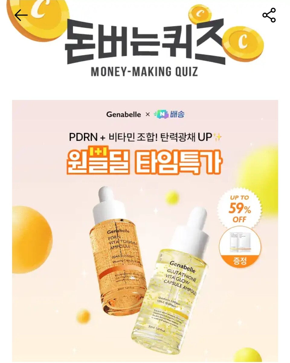 제나벨 비타민 캡슐 앰플 캐시워크돈버는퀴즈 문제는 "네이버뷰티 슈퍼위크 기간 한정으로 같은 라인의 OOOO2매를 증정하니 놓치지마세요!"이다.