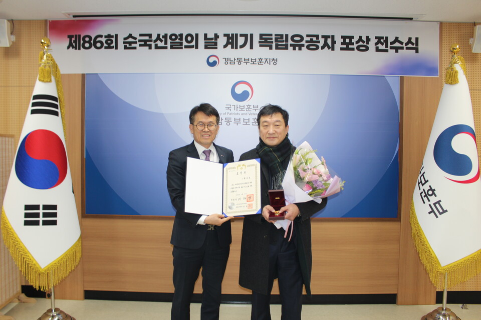 | 한스경제=김은희 기자 | 국가보훈부 경남동부보훈지청(지청장 김상우)은 19일 정부경남지방합동청사에서 국가를 위해 헌신하신 독립유공자의 숭고한 정신을 기리고, 그들의 희생에 대한 감사의 마음을 전하고자 뜻깊은 포상 전수식을 개최하였다.