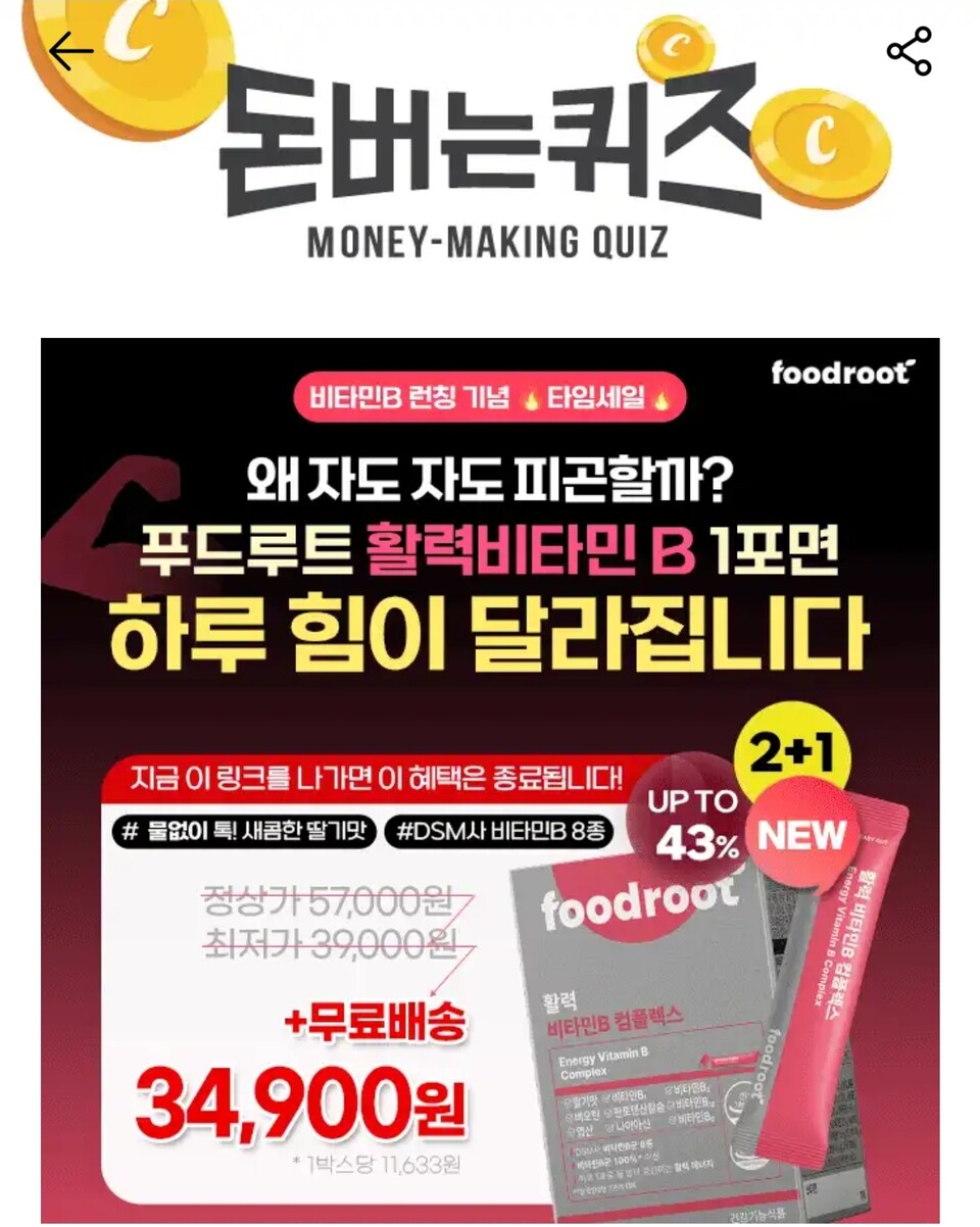 푸드루트 캐시워크돈버는퀴즈 문제는 "푸드로트 뼈건강 비타민은 튼튼한 뼈를 위한 비타민D 뿐 아니라, 뼈 구성에 필수인 OOOO7 비타민K2을 함께 배합해 체내 흡수율을 높였습니다"이다.