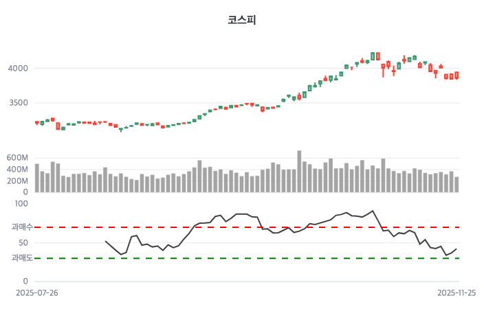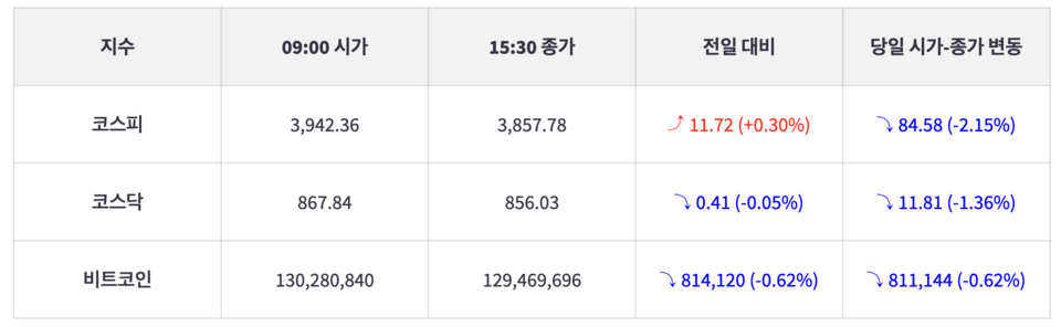 금일 코스피는 강보합 마감했다. 오전 장중 상승을 보였으나, 오후 상승폭을 줄이며 보합권에서 등락을 오고가다 외인 순매수로 가까스로 3850선을 회복하며 강보합 마감했다. 반면에 코스닥은 약보합 마감했다. 코스닥 또한 오후 장중 상승폭을 줄이면서 850선에서 마감했다.