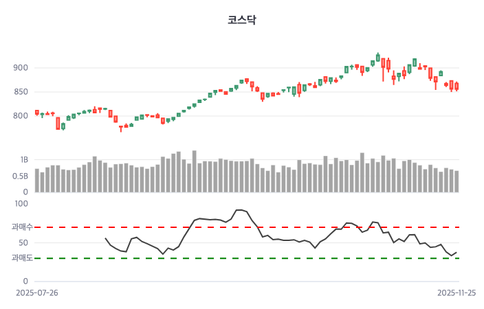 코스닥 지수는 이날 867.84에 출발해 871.68을 고점으로 기록한 뒤 856.03로 거래를 마쳤다. 전거래일 대비 0.41포인트(-0.05%) 하락했고, 시작가보다는 11.81포인트(-1.36%) 하락했다.